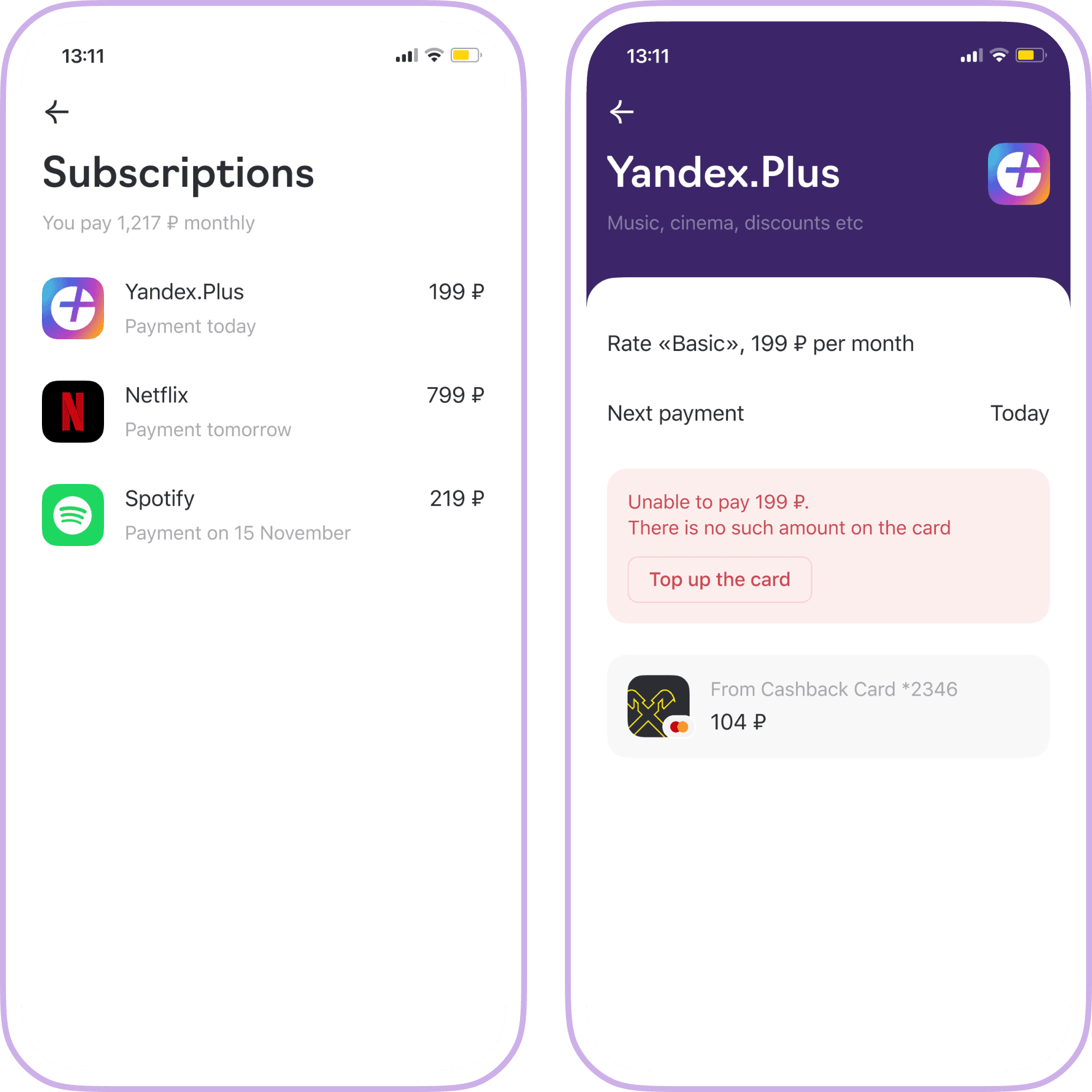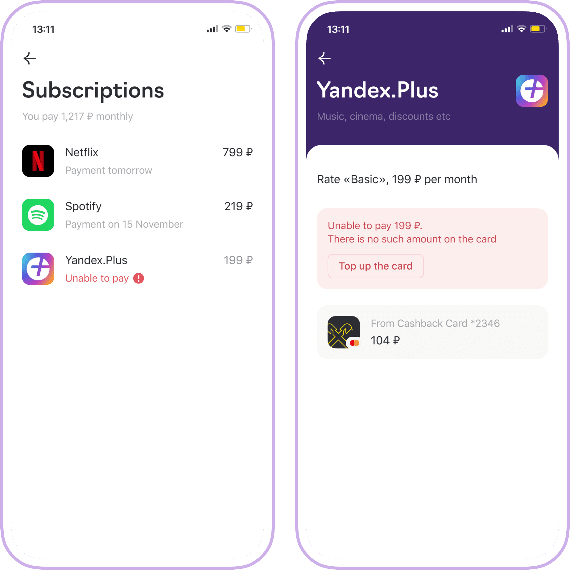 Subscription screen: «not enough money» status