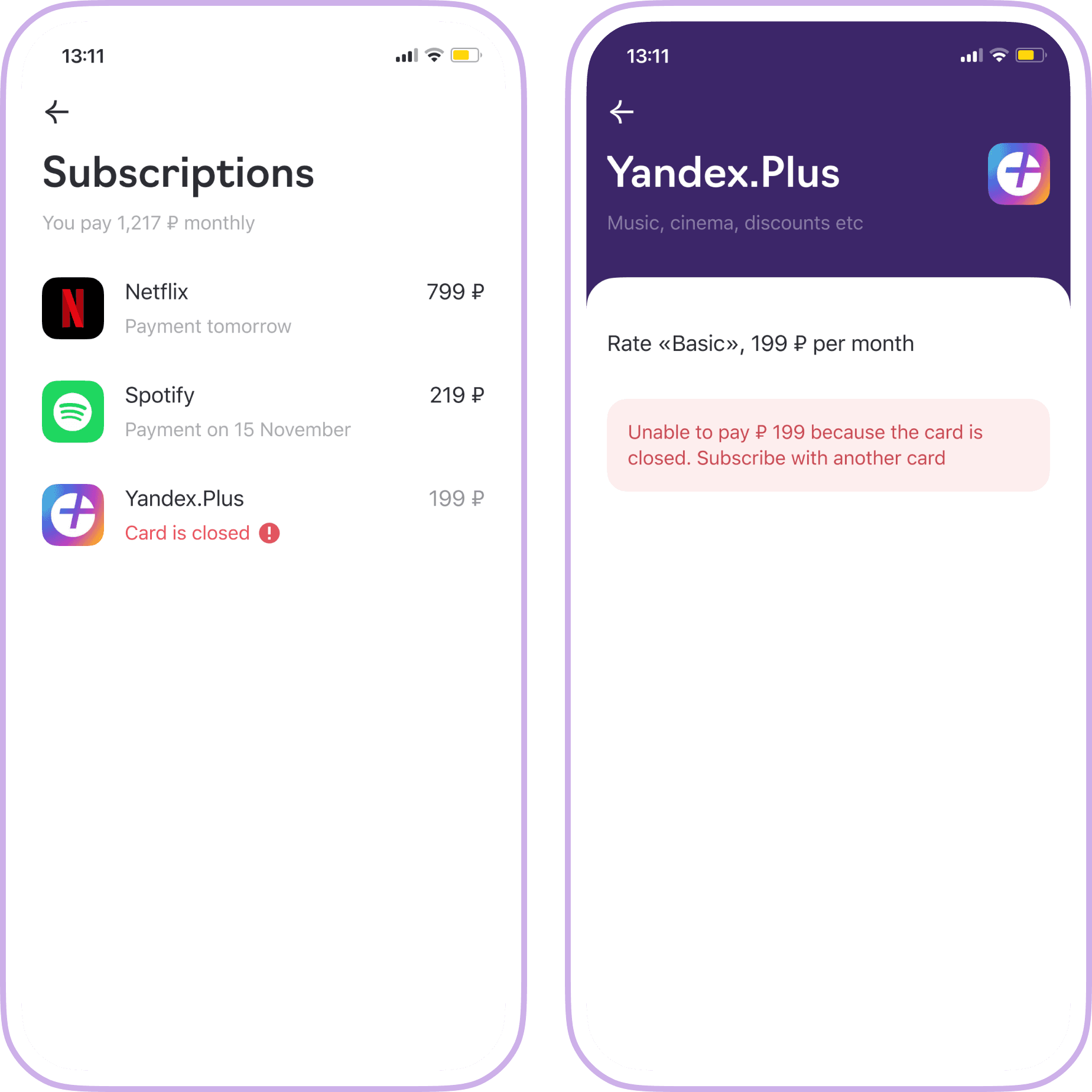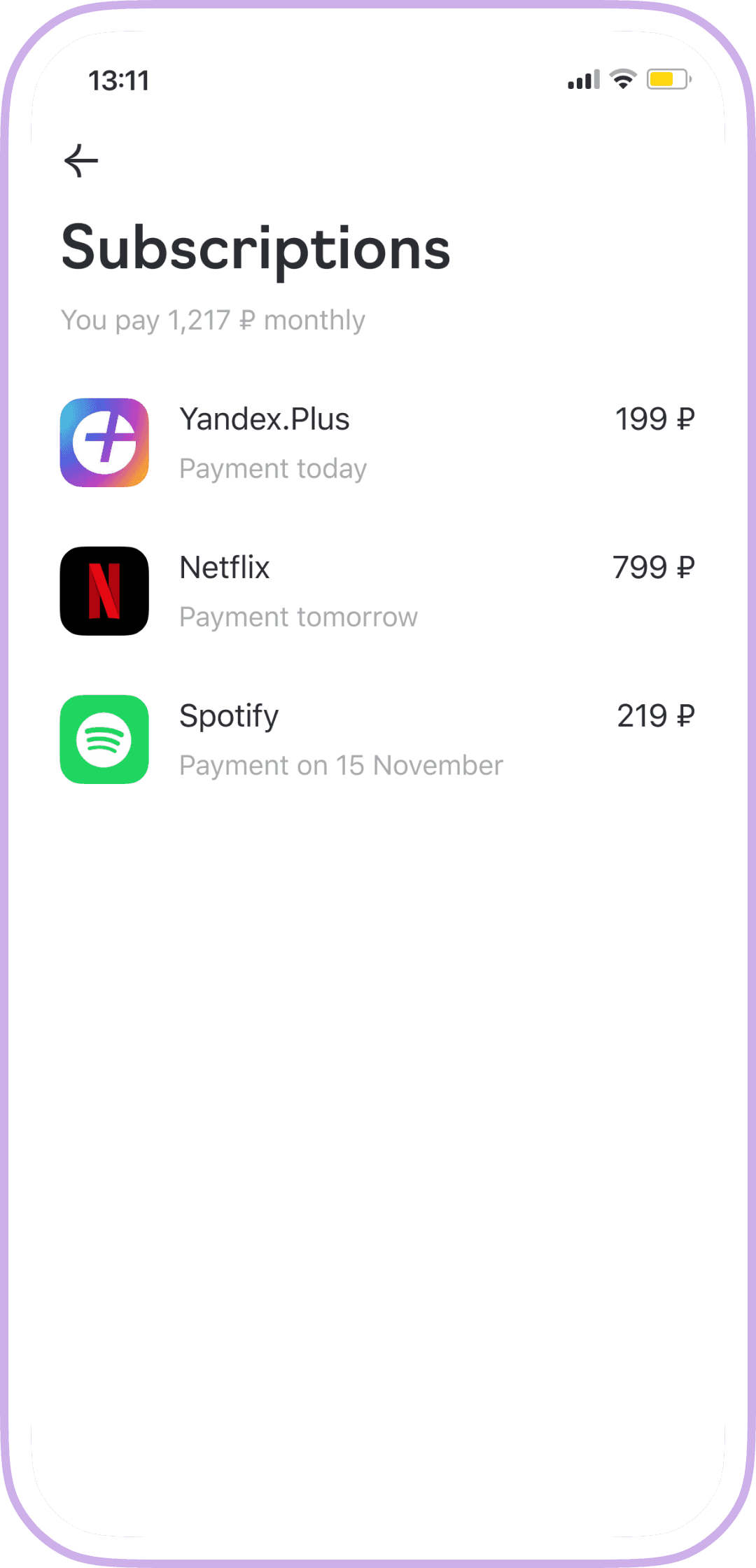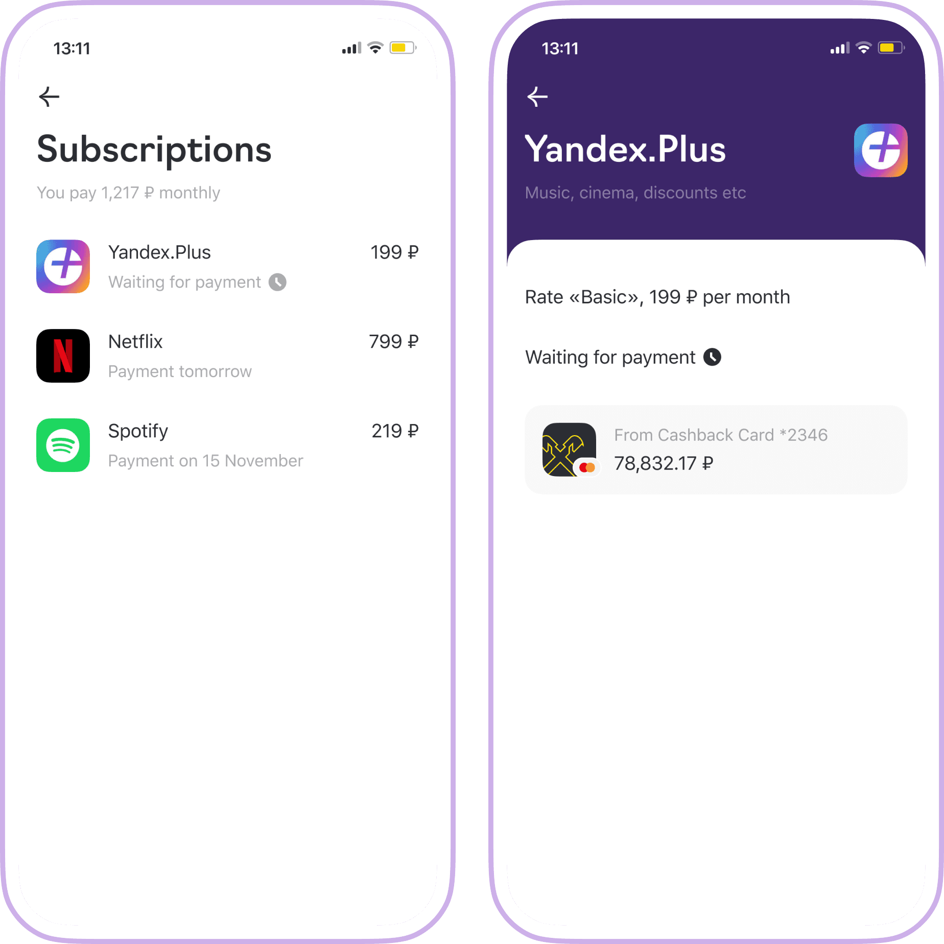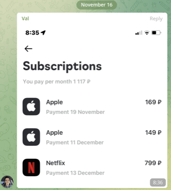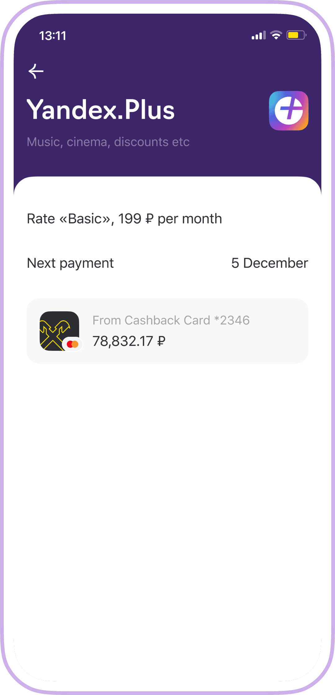 On the subscription screen, in addition to the basic information from the previous screen, we show additional details: category, rate, the card linked in the service, and the balance on the card.