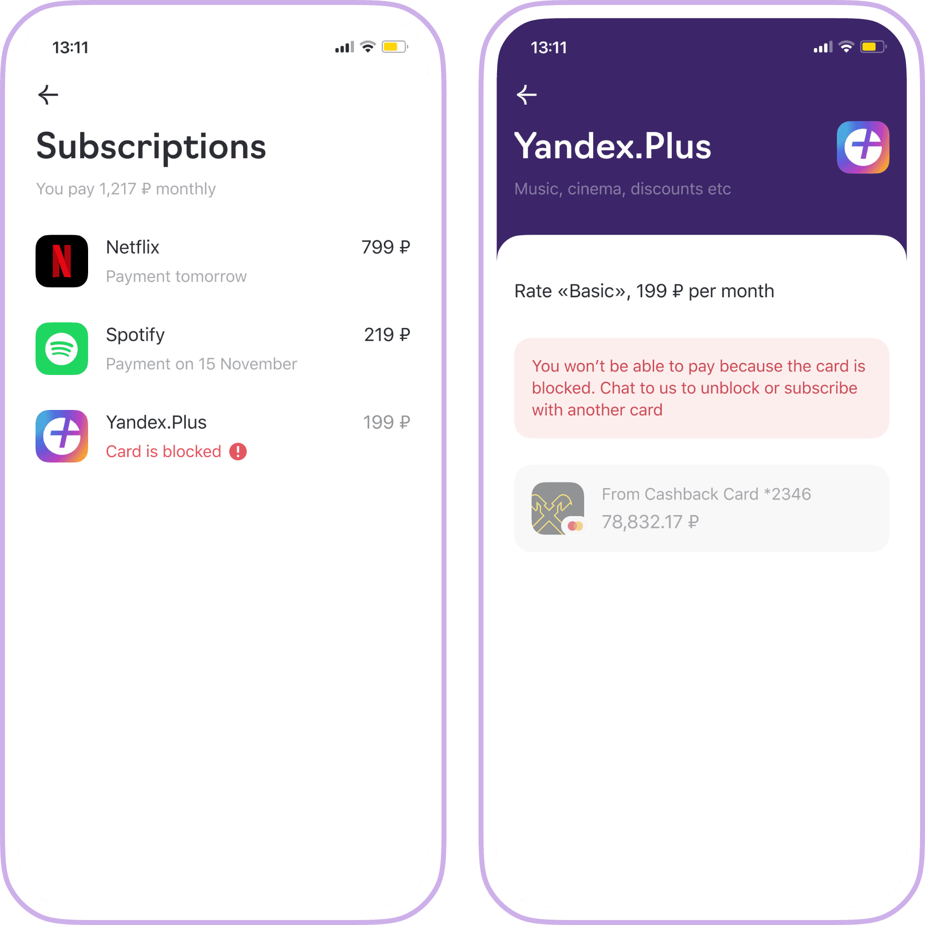 Subscription screen: «card is blocked» status